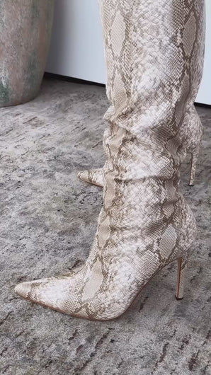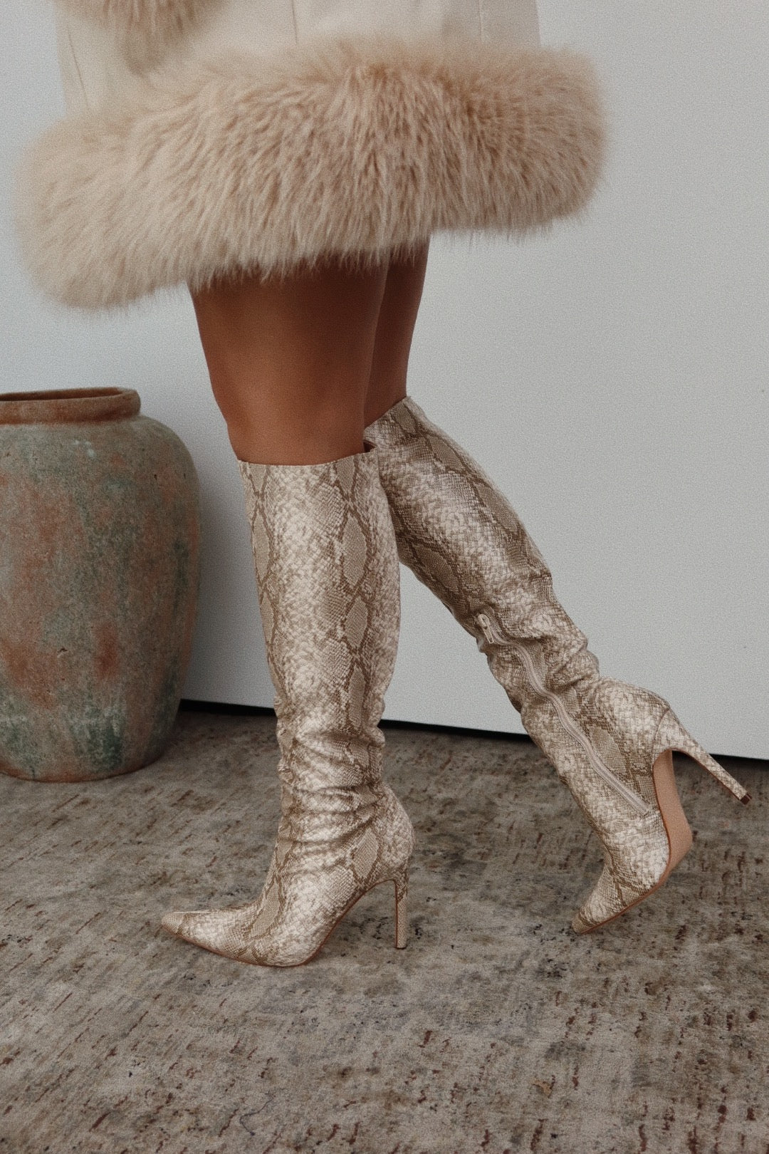 - Nude Snake Print Below The Knee Heel Boots - print placement may vary